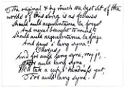 He routinely wrote her about his works, asking her reaction or even reacting to her letters with verse. On the 17th December 1788, Burns said in a letter to Mrs. Dunlop: “Your meeting which you so well describe with your old schoolfellow and friend was truly interesting. Out upon the ways of the world! They spoil these ‘social offsprings of the hear.’ Two veterans of the ‘men of the world’ would have met with little more heart-workings than two old hacks worn out on the road. Apropos, is not the Scotch phrase Auld Lang Syne exceedingly expressive? There is an old song and tune which often thrilled my through my soul. You know I am an enthusiast in the old Scotch songs. I shall give you the verses on the other sheet. …Light be the turf on the breast of the heaven-inspired poet who composed this glorious fragment! There is more fire of native genius in it than in half a dozen of modern English Bacchanalians.” The song on the other sheet was Burns’s first written version of “Auld Lang Syne.”(See photo) While Burns readily admits that he did not originate the tune and some verse, his is the version now sung every New Years Eve and Burns’ night by millions of English-speaking people around the world!
