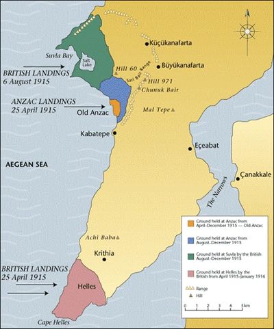 The Mediterranean Expeditionary Force (MEF) under General Sir Ian Hamilton was formed and in April 1915 began by landing a force on the Gallipoli Peninsular. The MEF landed in three places; the Australian and New Zealand Army (ANZAC) Corps' at Z Beach on the west coast near Gaba Tepe, the French at Kum Kale on the Asiatic side and the British at Cape Helles on the toe of the Gallipoli Peninsula. The objectives of the land forces was to take the heights, destroy the Turkish forts protecting the Dardanelles straights and facilitate the movement of heavy naval units into the Sea of Marmara to bring about the exit of Turkey from its alliance with Germany.