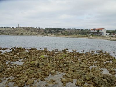 V Beach from SS River Clyde shoal, V Beach Cemetery in the centre, the Helles Memorial on the skyline with the Redoubt strong point to the right of the memorial. Photo; Andrew Dunlop.
