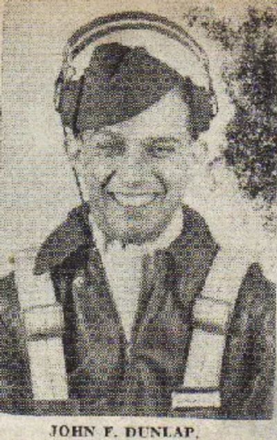 2nd Lt. John Francis Dunlap of Parker , Pa was a pilot trained at Randolph Field, Texas. He was scheduled to go to Burma in 1943 before he was blinded in an accident. This accident caused him to lose an eye, grounding him before he could fly a mission. His daughter Nancy states that the accident probably saved his life! He was medically discharged. (submitted by Nancy Dunlap Collette) Brother of Harold A Dunlap (above).