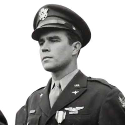 Austin Dunlap, Pilot, 350th 100th Bomber group . He flew multiple bomber missions over Germany and France in June, July and Sept 1944. The 100th Bomb Group (H), flying the B-17 "Flying Fortress", would become combat operational beginning June 25, 1943. Any sense of adventure and bravado came to a halt on that first mission; three planes and 30 men were lost over Bremen. The average life of an 8th Air Force B-17 crewman in 1943 was eleven missions! The 100th BG from June 1943 to January 1944 concentrated its efforts against airfields, submarine facilities and aircraft industries in France and Germany. During this time the Group was involved in the epic air battles over Regensburg-Aug.17, 1943 (for which it received it first Presidential Unit Citation) and Black Week-October 8-14, 1943 (Bremen, Munster, Marienburg and Schweinfurt-nicknamed "Black Thursday" because the 8th Air Force lost 60 bombers). Although the 100th did not have had the highest over-all loss rate of any group in the Eighth Air Force, it did have heavy losses during eight missions to Germany. Thus earning the nickname "The Bloody Hundredth".